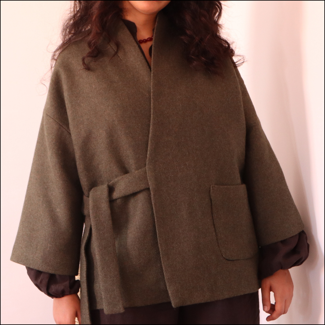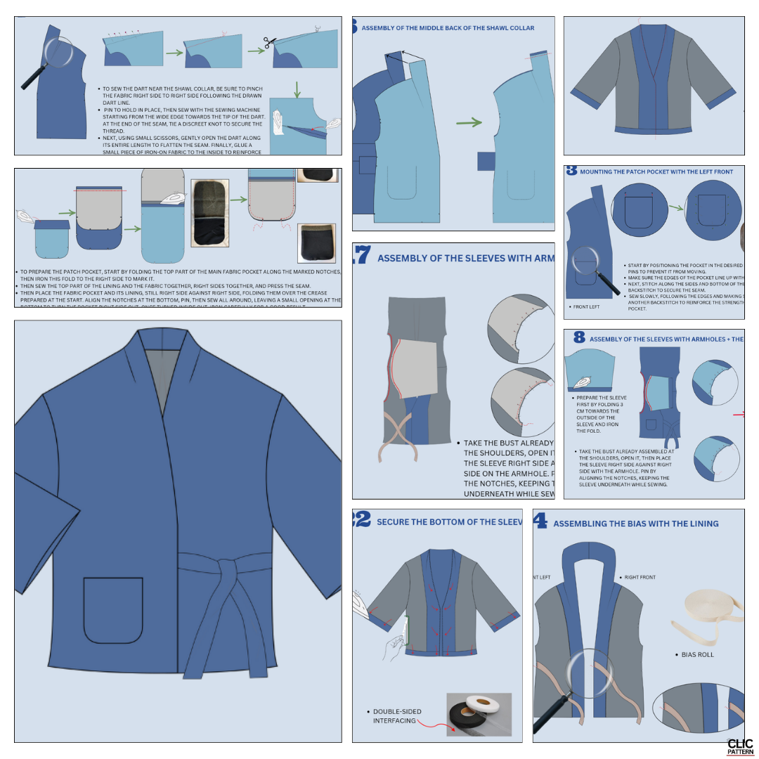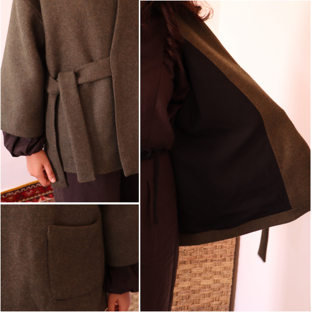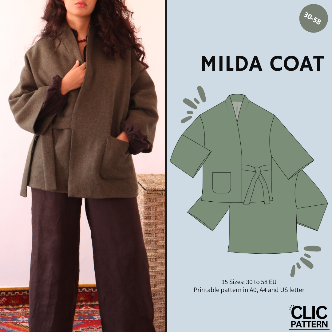 Entdecken Sie den Mantel MILDA : ein zweireihiger Mantel mit Bindeband vorne, der knapp unterhalb der Hüfte endet, mit einem strukturierten Schalkragen , weiten 3/4-Ärmeln und einem vollständig gefütterten Obermaterial für optimalen Tragekomfort. Ein raffiniertes Kleidungsstück mit subtiler, asiatisch inspirierter Eleganz – originell, stilvoll und perfekt für jeden Tag. Die Nahtzugabe von 1 cm ist bereits berücksichtigt.